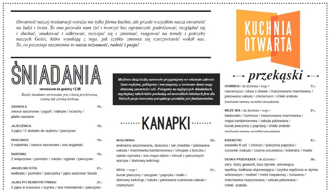 - Kuchnia Otwarta to restauracja codzienna. Karmimy uczciwie, sezonowo, w przystępnych cenach. Jesteśmy lokalem sąsiedzkim, którego celem są silne, przyjacielskie relacje z mieszkańcami Wilanowa i okolicy. Kierunek kuchni: polski - według autorskiej wizji naszego Szefa Kuchni.